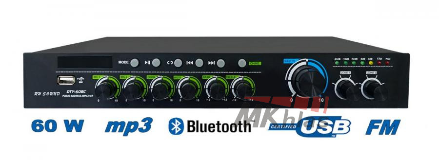 Moderní digitální (Class-D) rozhlasová ústředna malých rozměrů pro všestranné ozvučení se zabudovaným MP3 přehrávačem z USB a přehráváním MP3 přes BLUETOOTH.