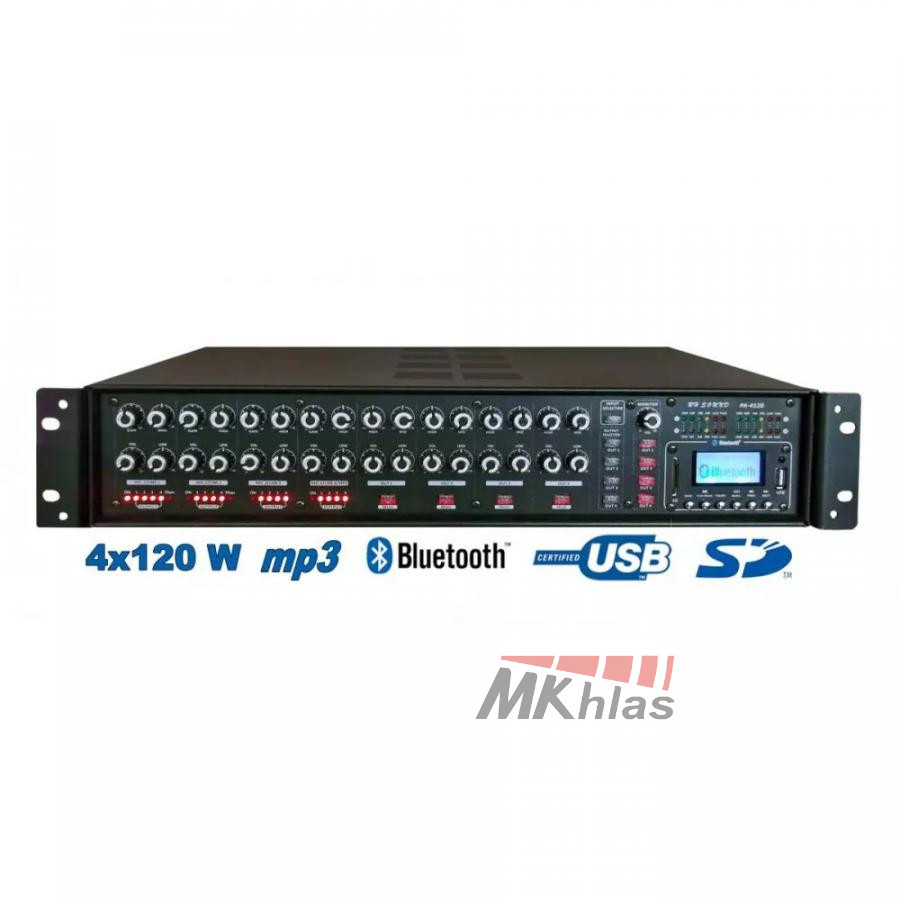 Moderní 100 V, 4 zónový zesilovač pro všestranné ozvučení se zabudovaným MP3 přehrávačem, přehráváním přes BLUETOOTH/USB/SD a dálkovým ovladačem, 4x regulovatelné zónové vstupy s možnost navolení do jedné ze čtyř výstupních zón. Možnost napájení z externí baterie DC 12 V, což oceníte při potřebě použití ústředny pro evakuační účely. Ústředna je vhodná k ozvučení hotelů, restauraci, barů, ozvučení kulturních sálů, domů smutku atp.