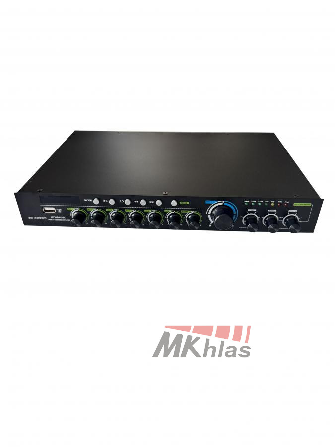 Moderní digitální (Class-D) rozhlasová ústředna pro všestranné ozvučení se zabudovaným MP3 přehrávačem z USB a přehráváním MP3 přes BLUETOOTH. 3 regulovatelné zónové výstupy (100 V). 2x Symetrické MIC vstupy: 1x XLR/Jack 6,3mm kombinovaný konektor, 1x Jack 6,3mm s funkcí ECHO, MIC 1 vstup s možností PHANTOM napájení, Funkce ECHO na mikrofonních vstupech s možností nastavení úrovně. Tlačítko CHIME (gong). 2x AUX IN (stereo cinch), 1x AUX OUT (stereo cinch), Konektory pro připojení USB klíče. Ústředna je vhodná k ozvučení obecního rozhlasu, školního rozhlasu a vyzvánění, ozvučení kulturních sálů, restaurací a domů smutku.