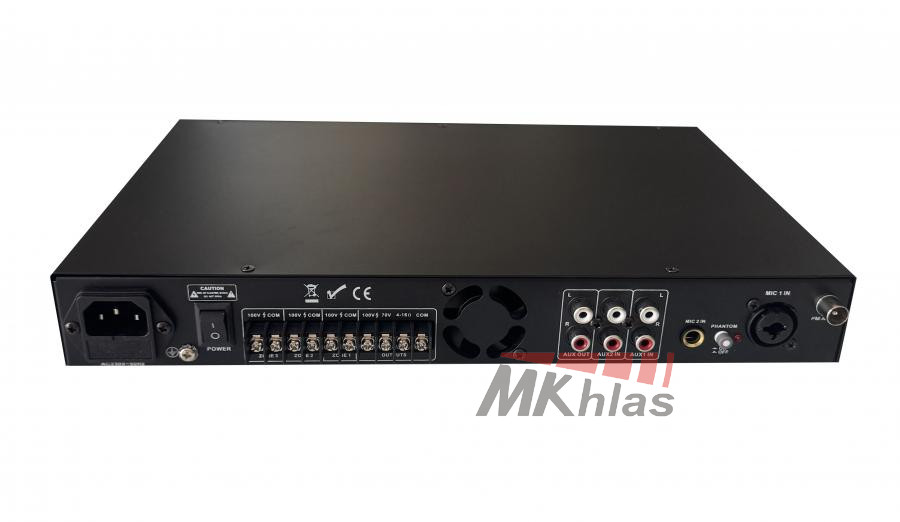 • 3 regulovatelné zónové výstupy (100 V), každá zóna s individuálním ovládáním hlasitosti,
