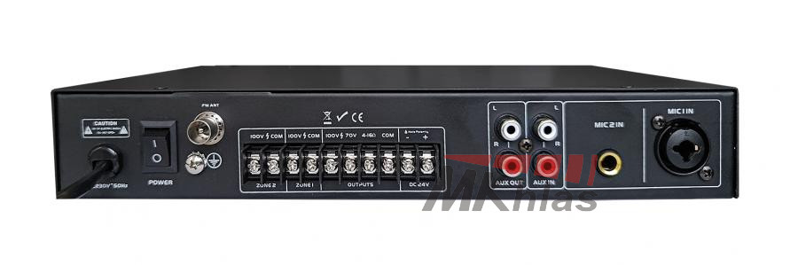 • Výstupní výkon: 60 W, 70 V - 100 V / 4-16 Ohm, výkon lze rozdělit do 2 zónových výstupů • Napájení: AC 230 V • Rozměry: 335 x 50 x 240 mm