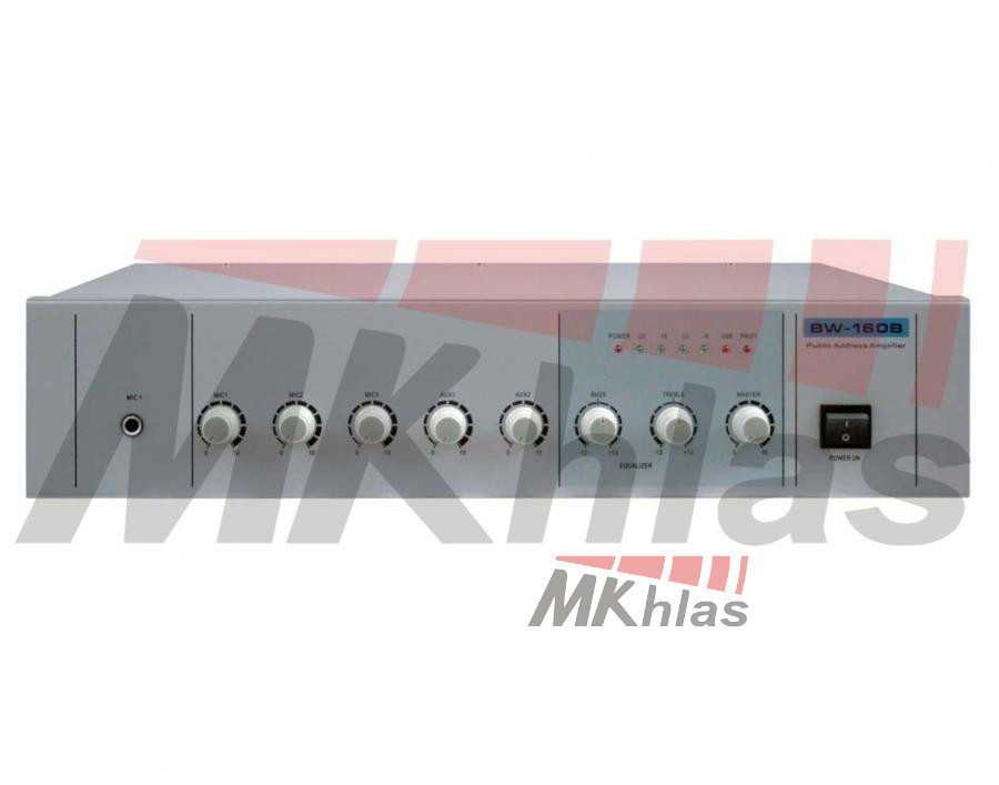 Zesilovač s mixážním pultem s 12V spínáním. Vstupy: 3 x MIC, 2 x AUX, hlavní hlasitost MASTER, 2-pásmové korekce, LED indikace výstupní úrovně, probuzení, 1x linkový výstup. Výstupy: 100V/4-16 Ohm.