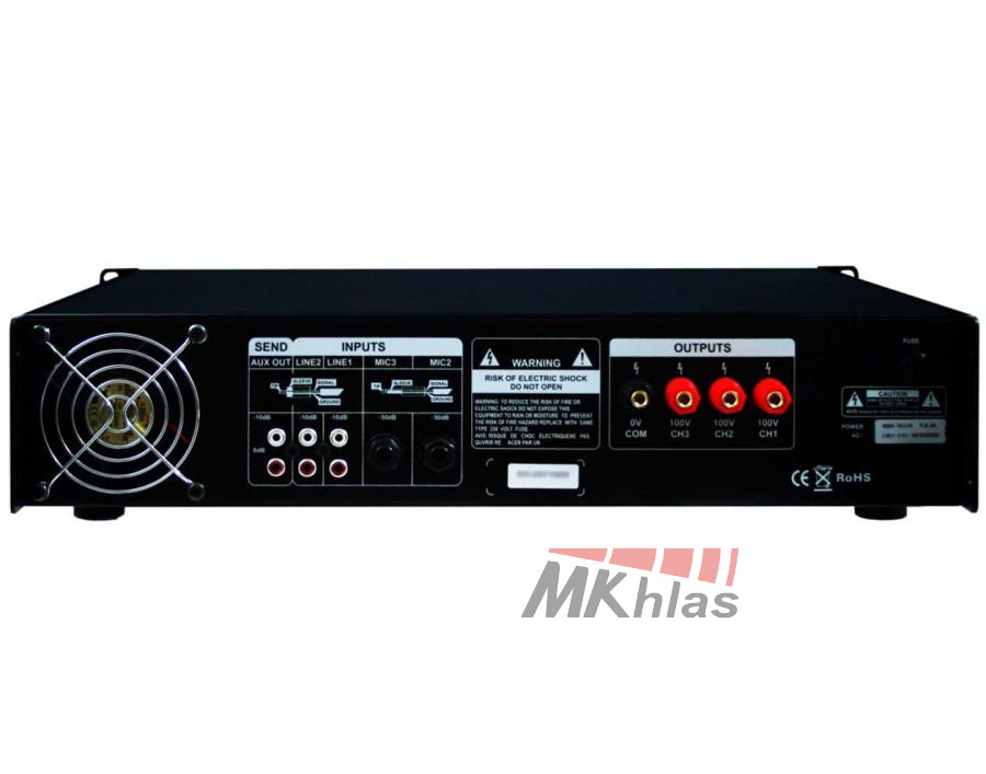 4-zónový zesilovač s mixem a vestavěným gongem. 5 vstupů: 3x MIC, 2x LINE, MIC1 prioritní, regulace hlasitosti vstupů, 3 samostatné výstupy s vypínačem, 5-LED indikace SIGNAL, LIMIT, 5-pásmový ekvalizér.