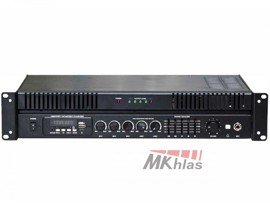 Zesilovač s MP3 přehrávačem z SD karet nebo USB klíče a FM tunerem. 5 vstupů: 3x MIC, 2x LINE, MIC1 prioritní, vestavěný GONG, regulace hlasitosti vstupů, 5-LED indikace SIGNAL, LIMIT, 5-pásmový ekvalizér. Provedení: 100V.