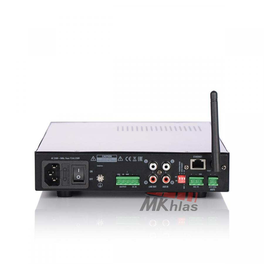Na zadním panelu se nachází (z leva doprava): napájení zařízení, nízkoimpedanční i 100V výstup na reproduktory, Linkový výstup, Aux vstup, přepínač fantomového napájení/vstupní priority, vstup pro mikrofon, mute (zatlumení hudby kontaktem), LAN připojení (RJ45), resetování, anténa.