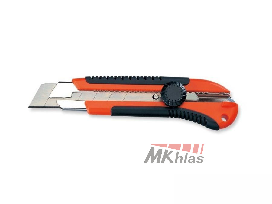 Masivní plastový kryt s pogumovanou rukojetí kovová lišta na čepel automatická fixace čepele a výměna čepele úschova náhradních čepelí uvnitř nože