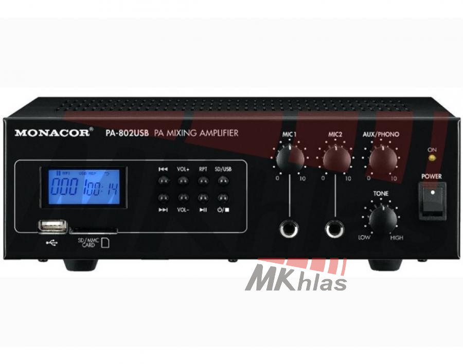 Jednoduchý mono 15 W zesilovač s ohmická i 100V výstupem. Integrovaný mp3 přehrávač umožňuje přehrávat hudbu z USB nebo SD karty. Vstupy: 2x MIC, 1xAUX. Výstupy: 1x 4ohm, 1x 8ohm, 1x 16ohm, 1x 100V