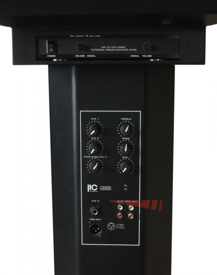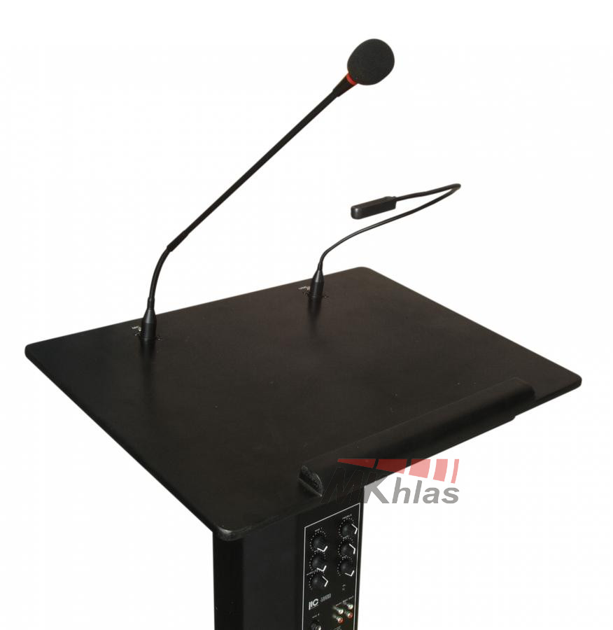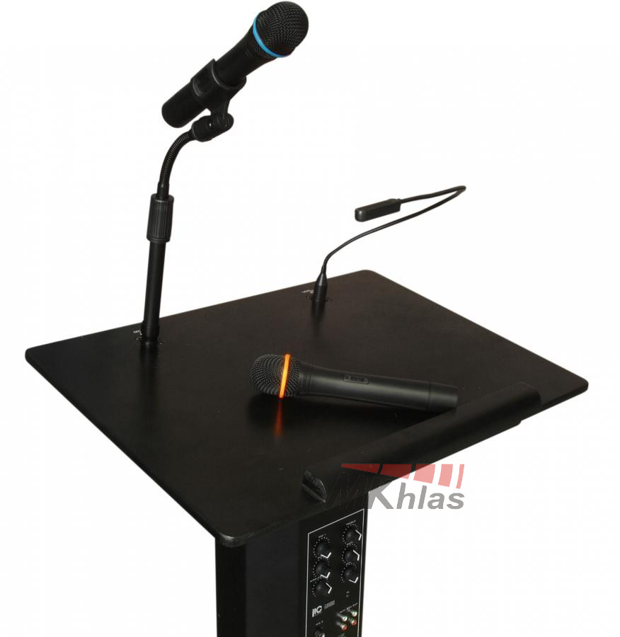 Řečnický pult se zabudovaným ozvučovacím systémem. Pult má v sobě zabudovaný zesilovač, 4 reproduktory (3x 4 "woofer a 1x 2" tweeter), 1 mikrofon s husím krkem a lampičku na husím krku. Dále obsahuje dva VHF bezdrátové mikrofony s dosahem do 30m. Na pultu se nacházejí 2x MIC, 1x AUX vstupy, nahrávací výstup. Obsahuje 2-pásmové korekce a samostatné ovládání hlasitosti každého vstupu. Má výstup na externí zesilovač a na externí reprosoustavu. Tento přenosný ozvučovací systém je vhodný pro meetingy, konferenční místnosti, hotely, školy, obřadní místnosti nebo domy smutku. Napájení je ze sítě: 220V / 50Hz (100W)