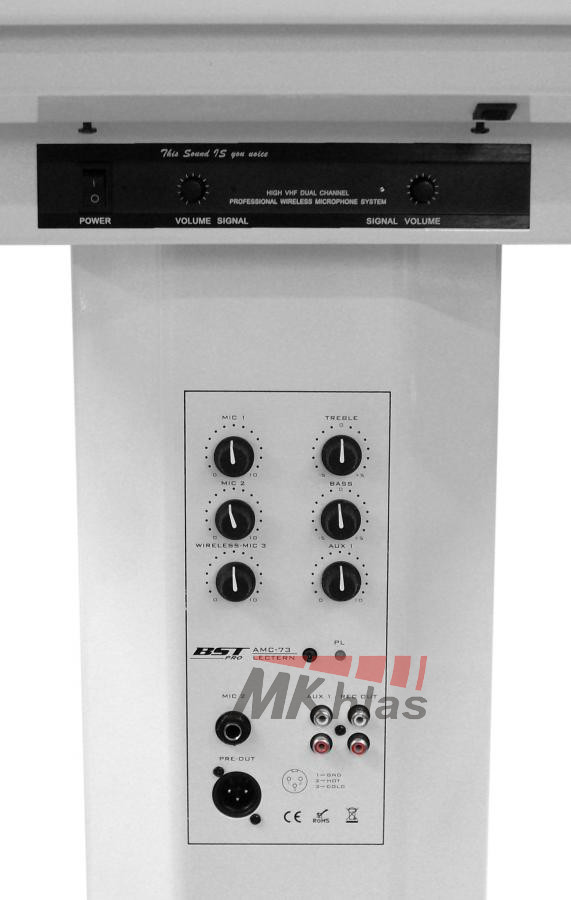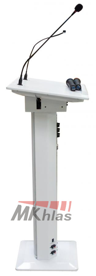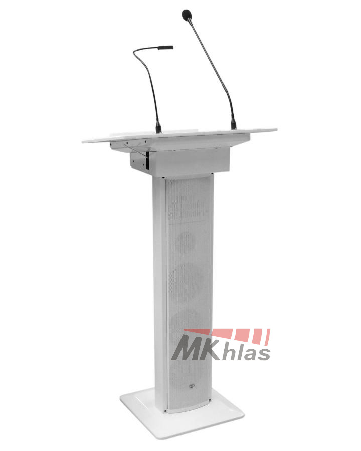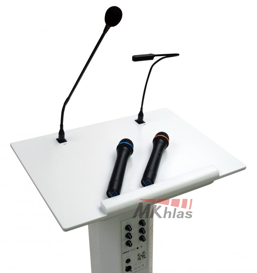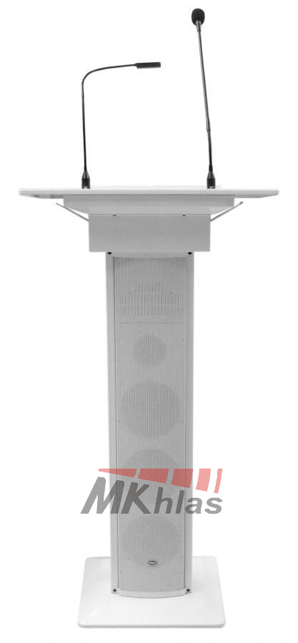Řečnický pult se zabudovaným ozvučovacím systémem. Pult má v sobě zabudovaný zesilovač, 4 reproduktory (3x 4 "woofer a 1x 2" tweeter), 1 mikrofon s husím krkem a lampičku na husím krku. Dále obsahuje dva VHF bezdrátové mikrofony s dosahem do 30m. Na pultu se nacházejí 2x MIC, 1x AUX vstupy, nahrávací výstup. Obsahuje 2-pásmové korekce a samostatné ovládání hlasitosti každého vstupu. Má výstup na externí zesilovač a na externí reprosoustavu. Tento přenosný ozvučovací systém je vhodný pro meetingy, konferenční místnosti, hotely, školy, obřadní místnosti nebo domy smutku. Napájení je ze sítě: 220V / 50Hz (100W)