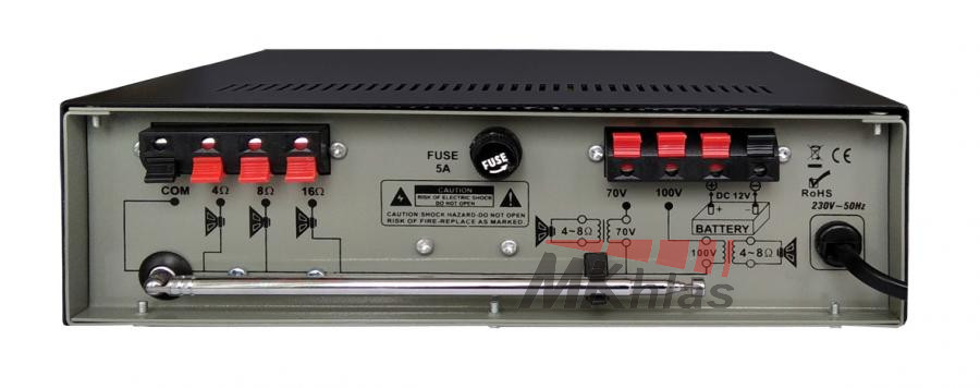 Výkon: 45 W (100V; 70V; 4-8-16 Ohm) • Napájení: 230 V AC, 12 V DC • Rozměry: 240 x 70 x 200 mm