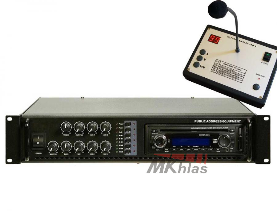 Velmi spolehlivá ústředna s výstupním napětím 100V. Jsou určeny pro plošné ozvučení obcí, škol, výrobních hal, stadionů. Jejich důležitou vlastností kromě spolehlivosti a příznivé ceny, je práce se zdroji signálu: rádiem (TUNER), CD-přehrávačem (CD Player s MP3) a nově i s mikrofonem s USB přehrávačem. Vstupy: 1x MIC, 1x AUX.