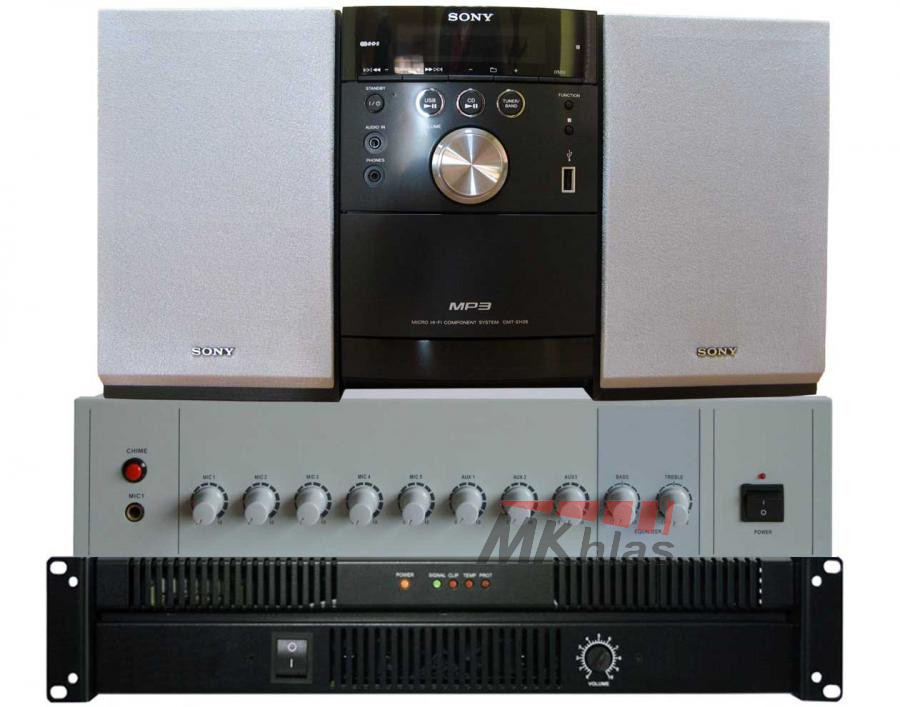Velmi spolehlivá ústředna se skládá z výkonového 100V zesilovače, řídící jednotky rozhlasové ústředny, CD/MP3 přehrávače s USB vstupem, rádiem, magnetofonem. Je určena pro externí spínání bezdrátového rozhlasu.