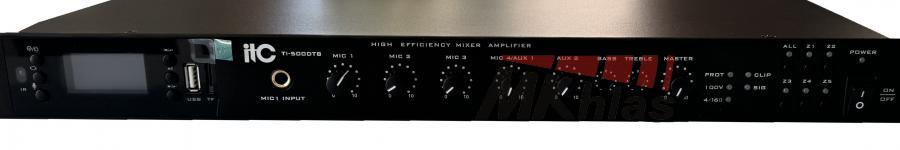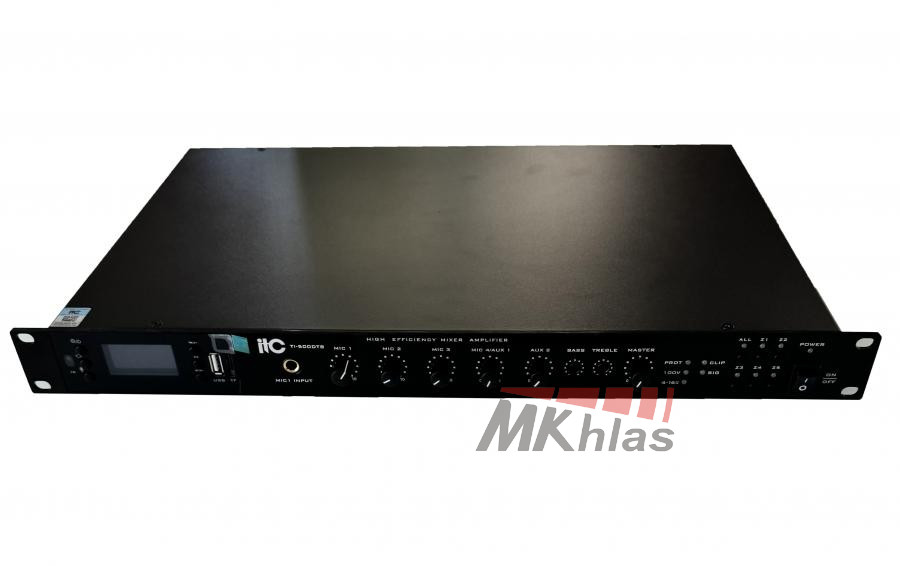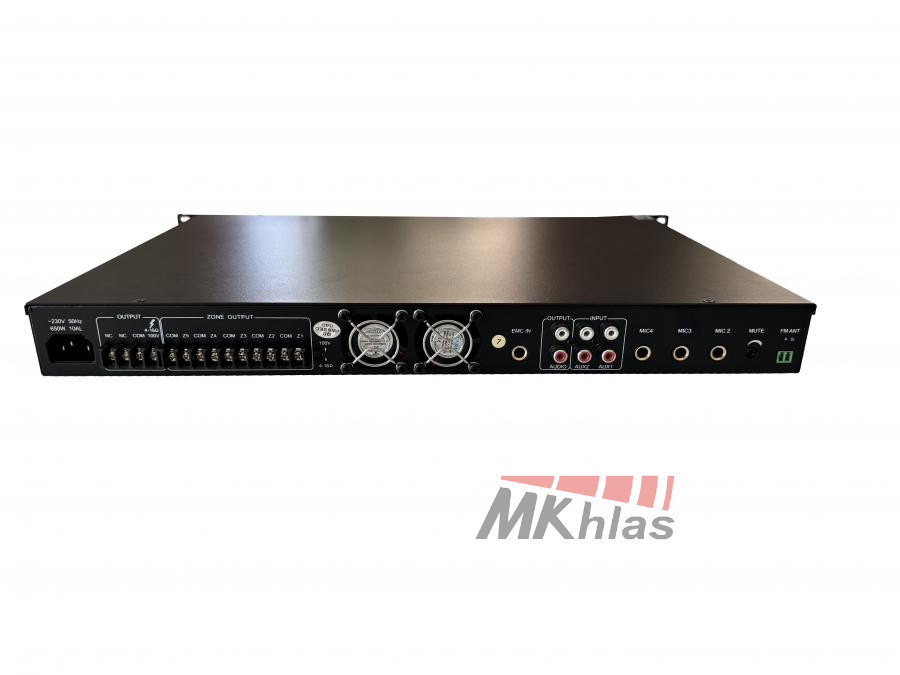 Směšovací zesilovač se zabudovaným Bluetooth a tunerem, využívá vysoce výkonný spínaný zdroj a technologii třídy D s designem 1U. S funkcí MP3 modulu dokáže číst MP3 soubory na USB flash disku, TF kartě. Nakonfigurujte dálkové ovládání MP3 kontrola; podporuje funkci vypnutí paměti, funkci nahrávání MIC. Podpora 1 kanálového vstupu EMC, 2 kanálů AUX vstupu, 4 kanálů MIC vstupu. Každý vstup má nezávislé nastavení hlasitosti s nastavením výšek, basů a hlasitosti. S indikací úrovně, přetížením a indikátorem ochrany; podpora zkratu, přetížení a přehřátí - ochranná funkce. S funkcí ztlumení zvuku; priorita mikrofonního vstupu je vyšší než linkový vstup; Priorita vstupu MIC1 je vyšší než jiný audio vstup; Vstup EMC má nejvyšší prioritu. Funkce priority kanálu: EMC>MIC1>MIC2/MIC3/MIC4/AUX1/AUX2/MP3. Výstup reproduktoru je 100 V nebo 4 ohmy; jmenovitý výstupní výkon je 60W, 120W, 240W, 350W, 500W. Napájení je střídavé, příkon je 90W, 160W, 300W, 500W, 650W. Nucené chlazení vzduchem zepředu dozadu, zapnutí na konstantní rychlost a zrychlení jako