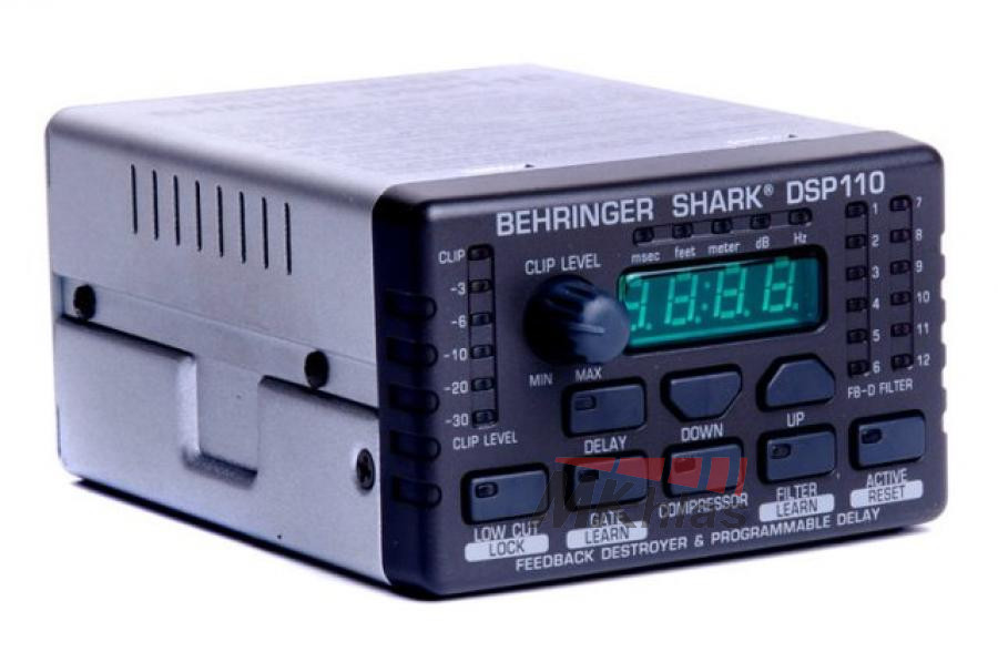 Populární nástroj k řešení problémů v sobě kombinuje mikrofonní Ultra-Low Noise předzesilovač s fantomovým napájením a linkovým předzesilovačem s mnoha nastaveními úpravy signálu, včetně známého potlačovače zpětné vazby (využívajícího důmyslný algoritmus obvodu Feedback Destroyer PRO DSP1100P), nastavení zpoždění reproduktorů s nastavením časového intervalu. Dále obsahuje kompresor a automatický potlačovač šumu Noise Gate, nízkofrekvenční filtr s proměnlivým nastavením. Přístroj je osazen 24-bitovými A/D a D/A převodníky s vysokým rozlišením, zaručujícím přesnou reprodukci zpracovávaného audio materiálu. Shark DSP110 díky nezvykle úzké šířce pásma (minimum: 1/60 oktávy) omezuje pouze nežádoucí zpětnou vazbu bez zásahu do kmitočtového spektra hudby. Shark DSP110 poskytuje 48V fantomové napájení.