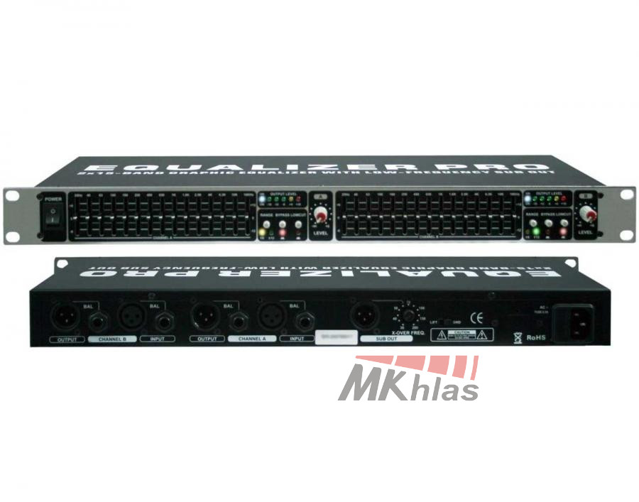 2 x 15-pásmový ekvalizér s pevnou Q charakteristikou. Spínače EQ ON zařazení/vyřazení EQ, RANGE s rozsahem regulace výstupní úrovně - 6 dB nebo -12 dB, L.OUT horno propustný filtr 80Hz 12dB/Oct. Subbas výstup nastavitelný 30Hz-200Hz. Zásuvky typu JACK 6,3mm a XLR jak pro vstupy tak pro výstupy. LED indikace výstupních úrovní.