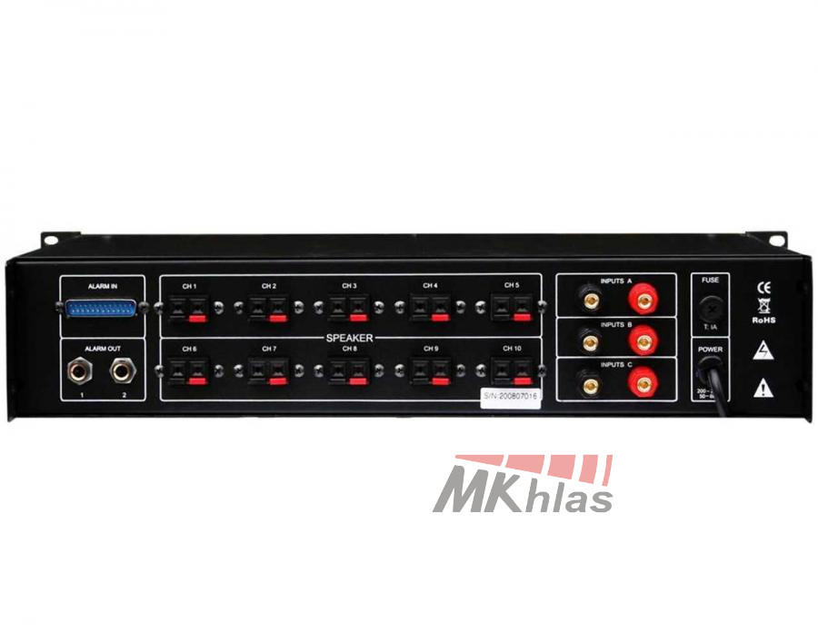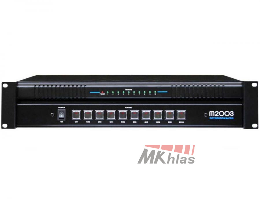 Linkový odpojovač pro 10 výstupních zón, pro 100V rozvody. Indikace vstupní úrovně, vstup pro dálkové ovládání. 19\" provedení.