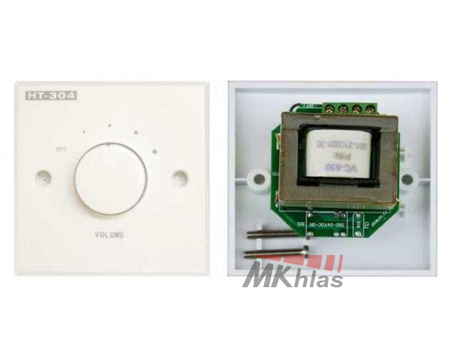 Regulátor hlasitosti s nuceným poslechem je určen pro regulaci hlasitosti reproduktorů s maximálním výkonem do 10W v 100V linkových rozvodech. Je osazen 100V transformátorem. Skoková regulace v 5 stupních.