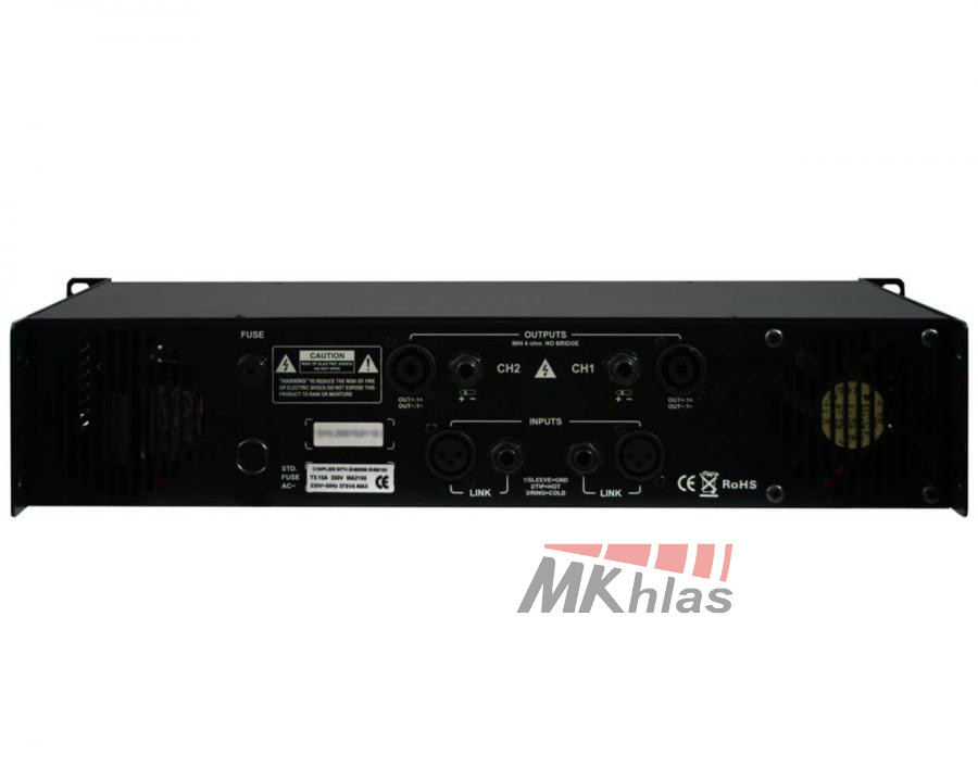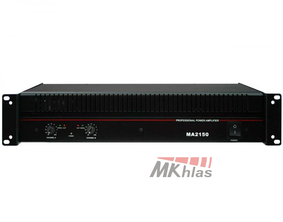 Výkonový stereozesilovač 2 x 150W/4 Ohm, 2 x 100W/8 Ohm. LED indikace PEAK, ON, všechny ochrany, nucené chlazení ventilátorem.