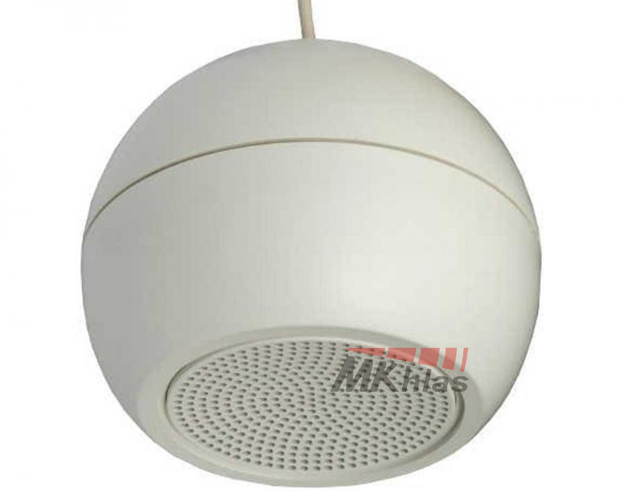 Závěsný kulový reproduktor je ideálním řešením pro prostory s vysokým stropem, kde by bylo ozvučení klasickými reproduktory neefektivní (obchodní domy apod.). Sférický plastový reproduktor v bílé barvě je uzavřen mřížkou, délka závěsu 5m. Je určen pro 100V linkové rozvody. Regulovatelný výkon: 16/8/4 W.