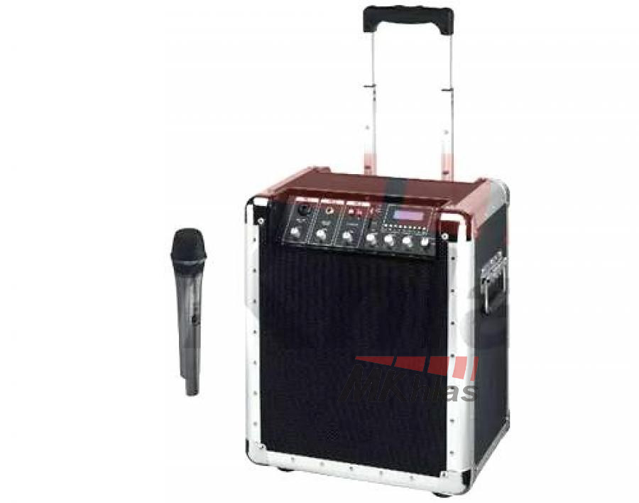 Přenosné ozvučení s MP3/USB přehrávačem, bezdrátovým mikrofonem. Dvoureproduktorový systém zaručuje široký frekvenční rozsah reprodukce. Výhodou je zabudovaný akumulátor s indikací nabití, a bezdrátový mikrofon s indikací stavu baterie. Sepnutím mikrofonu se dálkově ztiší hudba. MP3 soubory je možné přehrávat z USB klíče nebo SD karty. Souprava je vybavena taky dalšími vstupy a výstupy: 1x mikrofonní vstup symetrický, 1x mikrofonní vstup nesymetrický, linkový stereo vstup a linkový výstup na zadním panelu soupravy. Další ze skvělých vlastností jsou kolečka na přesun soupravy na způsob cestovního kufru. Ze spodní strany je systém předpřipravený k nasazení na stojan.